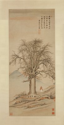 有學者認為此圖是一幅寓意懷念故國的人物畫,是項圣謨在明王朝滅亡以后創(chuàng)作的,表達了他對故國的懷念和寄托著深沉的哀思。圖中近處陂陀上古樹一株,參天獨立,樹下一老人攜杖背向而立,仰首遙望遠處青山和落日余暉,徘徊行吟,似不忍離去。圖右上作者自題七言絕句一首:“風號大樹中天立,日薄西山四海孤。短策且隨時旦莫(同暮),不堪回首望菰蒲?!惫艠涞男蜗笏茉祯r明獨特,背景簡煉空曠,像是閱盡滄桑,飽經風雨,樹葉雖經霜雪的摧殘,飄零罄盡,但是卻傲然挺立,有一種不可屈服的內在精神。整個畫面包括詩題,給人一種沉郁、悲憤、孤寂、蒼涼之感。