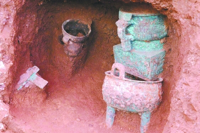 通過發(fā)掘,考古專家發(fā)現(xiàn)了目前石鼓山西周墓地中最大的一座墓葬。該墓葬呈長方形,深8米、寬約4米,為豎穴土壙墓,口小底大,約16.26平方米,棺室周圍有熟土或生土二層臺(tái)。屬于單人葬,頭向朝著地勢較高的方向,有東向、南向及西北向。葬具均為木質(zhì),隨葬品一般置于頭部附近的二層臺(tái)或壁龕內(nèi)。