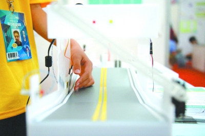7月17日,世界青少年發(fā)明展在黑龍江省哈爾濱市舉行。來自中國、泰國、馬來西亞、日本、印度尼西亞等國家和地區(qū)的青少年通過自己的創(chuàng)意發(fā)明,展示了各自的奇思妙想。圖為中國臺灣的學(xué)生在展示由其設(shè)計的城市內(nèi)澇停車場自動感應(yīng)裝置。