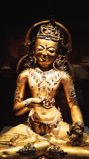 首都博物館藏銅鍍金金剛薩埵菩薩像(元)帶項(xiàng)圈和長瓔珞,并鑲嵌綠松石。