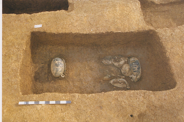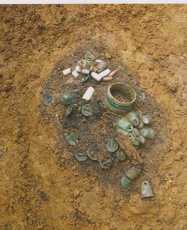 第二天一早,興奮了一夜的隊員們再次來到出土這些奇形怪狀器物的祖家老包小土丘上,在朝陽的映襯下,那黃色的土地顯得異常的親切,仿佛它們已等了兩千年,今天終于等來了破解這塊黃土地下掩埋著的神奇密碼的考古隊。在祖家老包附近不同的土丘上,隨著犁鏵的條條犁痕,一座座土坑墓的墓邊和里面夾雜著大量紅燒土顆粒的墓葬填土異常醒目,不用說,這是一處與此前發(fā)掘的漢墓不同的青銅時代墓地??脊抨犚膊患敝贞牷刭F陽了,將正在發(fā)掘的漢墓清理完后,迅即轉(zhuǎn)戰(zhàn)祖家老包,當(dāng)年即清理了25座夜郎時期不同于漢墓的地方土著民族墓葬,發(fā)現(xiàn)了非常奇特的“套頭葬”和一批獨具地域特色的青銅器,包括容器、兵器和裝飾器等,真正揭開了貴州夜郎考古的序幕。