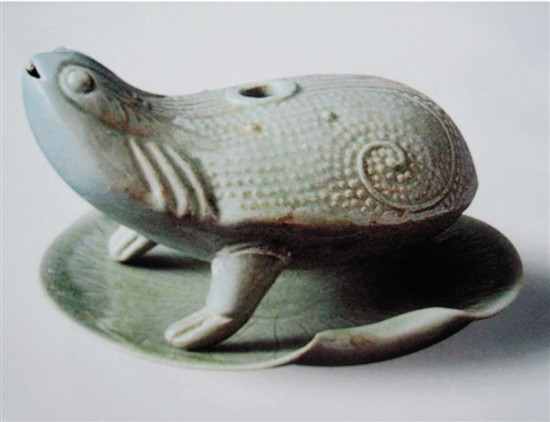 越窯青瓷蟾滴,原稱“三足蟾蜍水盂”或“三足蟾蜍形帶托盤青瓷水盂”,為1983年12月10日出土于浙江省慈溪市彭東鄉(xiāng)寺龍橋頭泥沙中。全器十分完整,通高6.7厘米,系在荷葉形托盤中,上置蟾蜍形水盂組合而成。淡灰胎,質(zhì)細(xì)膩,通體施湖綠色薄釉,滋潤(rùn)光亮,局部表微泐,足面依稀見(jiàn)有支釘痕。從其輕盈端巧的器型特點(diǎn)來(lái)看,當(dāng)屬文房用具。清代許之衡著《飲流齋說(shuō)瓷》稱:“蟾滴、龜?shù)?由來(lái)已久。古者以銅,后世以瓷。明時(shí)有蹲龍、寶象諸狀。凡作物形而貯水不多者則名曰‘滴’?!被?,本器應(yīng)改稱“越窯青瓷蟾滴”為宜。