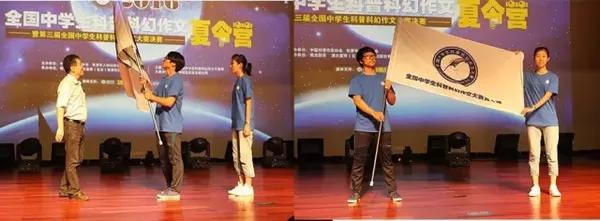 在熱烈的掌聲中,世界華人科幻協(xié)會會長,吳巖先生上臺授旗,標志著本次夏令營正式開始。他將科普科幻大賽夏令營的營旗傳遞給營員代表將開幕式推向了高潮。