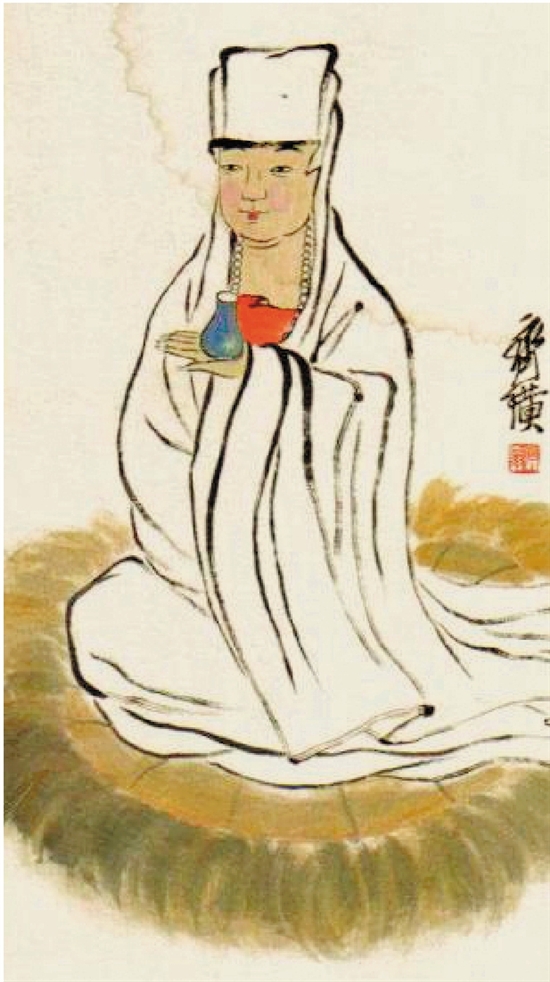 克隆拍品一,齊白石《觀音》(135×50cm,設(shè)色紙本立軸),成交價64萬元。該拍品明顯克隆抄襲自北京畫院藏齊白石《白衣大士圖》,真跡尺幅109×30cm,乃齊白石上世紀30年代所繪。真跡繪一白衣大士手托凈瓶盤地而坐,人物神態(tài)安詳,用線一氣呵成,設(shè)色濃而不俗,整件作品體現(xiàn)了齊白石“簡括而不草率”的人物畫特征。反觀克隆之作,用線輕浮無力,設(shè)色淡而不正,人物毫無神采可言,筆墨的疾澀、濃淡、飛白處理效果也大為遜色(如蒲團的用筆),題款鈐印完全照搬,但盡露亦步亦趨之態(tài)。最明顯的是偽作將人物畫在正中,十分呆板,與齊白石真跡將白衣大士巧妙安排在畫面左側(cè),人物重心的移動使畫面富于變化相比大相徑庭。