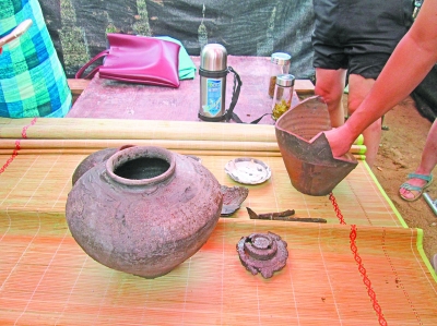 昨天上午7點,新洲區(qū)文物管理所5名考古人員趕至沙河支流九明灣村河段,對古墓進(jìn)行搶救性發(fā)掘,3臺抽水泵不停抽排墓室周圍的積水,當(dāng)整個墓室露出水面后,考古人員首先將墓窒上的石板揭開,一個約3平方米的墓穴呈現(xiàn)在考古人員面前,墓穴內(nèi)堆滿淤泥。