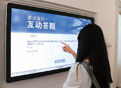 “當(dāng)事人及其訴訟代理人因客觀原因不能自行收集的證據(jù),或者人民法院認(rèn)為審理案件需要的證據(jù),人民法院( )調(diào)查收集?!崩ㄌ?hào)里選項(xiàng)有“可以”“應(yīng)當(dāng)”“應(yīng)當(dāng)委托律師”。在人機(jī)知識(shí)問答平臺(tái)區(qū)域,筆者看到,林女士正認(rèn)真地答著題,一番思考后,她在答題屏幕上按下了“應(yīng)當(dāng)”這個(gè)選項(xiàng)。隨即屏幕上便彈出:“恭喜您答對(duì)8道題,獲得普法達(dá)人稱號(hào)?!薄耙还?0題,對(duì)了8道,我還是很開心的?!绷峙颗d奮地說,“我覺得這個(gè)互動(dòng)答題的板塊特別好,這種知識(shí)問答的形式能讓人們?cè)谟螒蛑袑W(xué)習(xí)法律知識(shí)?!?/p>