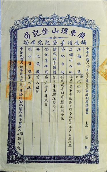 老字號“張發(fā)記”的一些登記文件也在該批藏品之中,張興吉翻看著《廣東瓊山登記局鋪底頂手登記完畢證》和《建筑物登記簿》告訴記者:“這些就相當(dāng)于是現(xiàn)在的鋪面轉(zhuǎn)讓證據(jù)和在政府的房屋建設(shè)登記,表明了當(dāng)時鋪面的轉(zhuǎn)讓情況,從文件看來,這間房屋是中式的,5年后,‘張發(fā)記’又接收了一家鋪面?!鳖愃七@樣的文件還有很多,足以對當(dāng)時的商號數(shù)量和經(jīng)營狀況窺見一二。