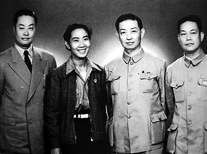 左圖為1949年秋程硯秋、袁雪芬、梅蘭芳、周信芳(從左至右)在一起留影