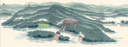 接到以西湖為主題的創(chuàng)作任務(wù),陳家泠便開始構(gòu)思,他想起了自己2010年創(chuàng)作的《西湖十景》,當(dāng)年他在杭州舉辦個展,要回饋故鄉(xiāng)和母親。這一次,還是畫西湖,他不打算再畫中國畫里常見的西湖美景,想畫的是G20峰會舉行之地,用他的話說,是西湖的新景觀、新面貌,他甚至有一個野心,就是希望畫中的景色能成為西湖的“新勝地”。在陳家泠眼里,西湖是人間仙境,山水草木無一不蘊(yùn)藏著生機(jī)與靈氣,西湖也是文化勝地,文人墨客從來都流連忘返,不惜筆墨。在《西湖景色》里,他想畫出西湖的自然美和文化美,實現(xiàn)現(xiàn)實性與前瞻性、現(xiàn)實與夢想、現(xiàn)實與藝術(shù)的融合。思謀許久,陳家泠選擇以深淺不一的綠作為畫面主色調(diào),以山水畫中的“米家點(diǎn)”為基本技法,暈染出一幅空靈、優(yōu)雅、迷蒙而富有生命力的西湖山水圖。傳統(tǒng)的米家山水僅用水墨,陳家泠卻在自己的創(chuàng)作中加入顏色,以期更符合現(xiàn)代審美,花青、藤黃,加上墨色勾線,整幅畫用色簡潔、大氣,山重水復(fù),綠意重重,呈現(xiàn)出蓬勃的生命力和高雅的意境,而這,也與陳家泠幾十年來的追求一以貫之。