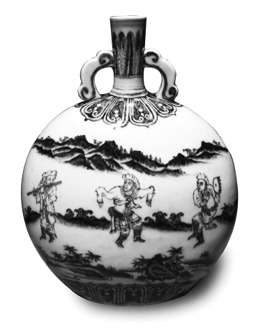 元朝藝術(shù)的一個(gè)招牌性的成就,是著名的元青花,但是臺(tái)北故宮沒(méi)有,因?yàn)樵嗷òl(fā)現(xiàn)的很晚,要到20世紀(jì)50年代才有人開(kāi)始研究,所以以前沒(méi)有人知道,清宮里也沒(méi)收藏。但是臺(tái)北故宮有很好的明青花,特別是早期的永宣青花,就是永樂(lè)宣德兩朝的青花。這次特展展出了一個(gè)永樂(lè)時(shí)期的“青花西域舞樂(lè)人物紋扁壺”,上面除了傳統(tǒng)的山水園景之外,還有五個(gè)西域人在奏樂(lè)跳舞,這是明早期青花里很罕見(jiàn)的主題,而且反映了當(dāng)時(shí)絲綢之路交流的情況,價(jià)值極高。