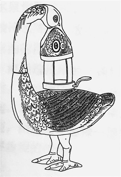 在漢代,雁魚(yú)構(gòu)成一種吉祥圖案,釭燈制成此型,無(wú)疑更會(huì)博得人們的喜愛(ài)。高度概括的造型和精湛的工藝,反映了當(dāng)時(shí)人們?nèi)诃h(huán)保理念與審美思想為一體的藝術(shù)追求。