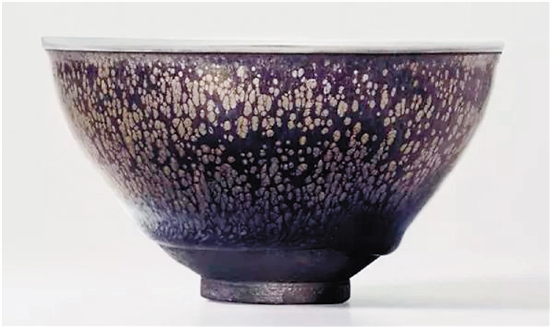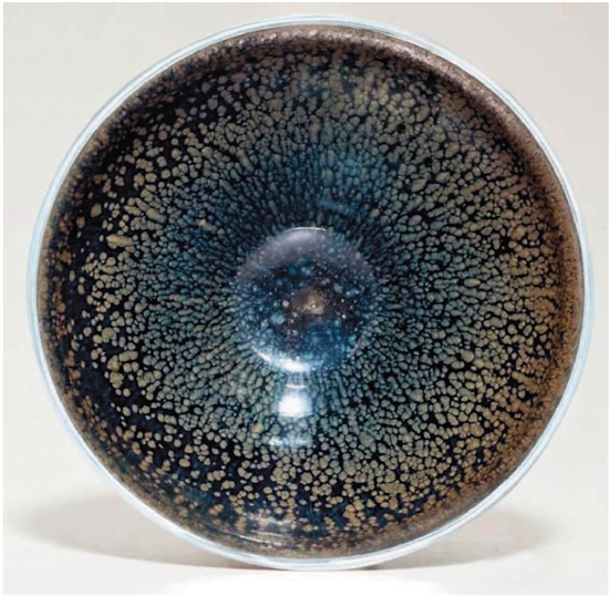 宋代斗茶藝術(shù)傳到日本,經(jīng)過吸收發(fā)展的抹茶道,能夠很好地流傳下來。優(yōu)美而稀少的建盞長期以來是日本上層階級珍藏的寶物,尤其在15世紀(jì)達(dá)到高潮?!毒_觀左右?guī)び洝酚涊d,曜變是建盞之無上神品,世上罕見之物,值萬匹絹。油滴是第二重寶,五千匹絹,兔毫盞,三千匹絹。當(dāng)今,優(yōu)秀的建盞大都被日本收藏。僅存于世的3件曜變都被日本藏為國寶。油滴傳世品也僅10余件,其中一件為日本國寶。我國沒有一件完整的油滴。藏于日本靜嘉堂文庫的曜變被國際陶藝界公認(rèn)為天下第一名碗并譽(yù)為陶瓷藝術(shù)的珠峰,但至今無人能復(fù)制,這也就可以理解當(dāng)年為什么會(huì)有1500套別墅總和的高價(jià)了。