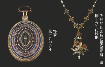 其他類型的珠寶飾品也同樣體現(xiàn)了設(shè)計(jì)師們的精美創(chuàng)意,以文藝復(fù)興時期及新藝術(shù)時期的飾品等最為突出。飛翔的丘比特吊墜項(xiàng)鏈、獅子形吊墜、舞女吊墜、橡果形胸針、蜜蜂形胸針、蝴蝶形胸針、酒神女祭司頭像胸針等,多選用造型富于變化的巴洛克式珍珠進(jìn)行大膽構(gòu)圖,將自然寓于藝術(shù)作品之中,用不同形狀的選材刻畫出巧奪天工的動物、植物、人物形象,使珍珠的表現(xiàn)力達(dá)到前所未有的高度。最引人注目的還有薩爾瓦多·達(dá)利設(shè)計(jì)的養(yǎng)殖珍珠與紅寶石唇形胸針,彰顯了藝術(shù)大師無可匹敵的設(shè)計(jì)視角和獨(dú)特的裝飾手法。
