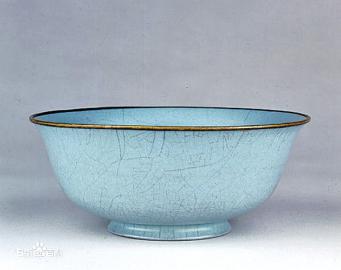 整個碗高7.1厘米,碗口直徑16.9厘米,圈足直徑7.5厘米,重350克。撇口,外鑲銅邊。深弧腹,圈足微外撇。胎體輕薄。通體滿釉,有細(xì)小開片。外底有5個細(xì)小芝麻狀支釘痕,內(nèi)底刻有楷書乾隆御題詩:“均窯都出脩內(nèi)司,至今盤多碗艱致。內(nèi)府藏盤數(shù)近百,碗則晨星見一二。何物不可窮其理,碗大難藏盤小易,于斯亦當(dāng)知懼哉,愈大愈難守其器?!焙笫稹扒”缬}”,并鈐“比德”“朗潤”二印。目前所見傳世宋代汝窯碗僅有兩件,除這件外,北京故宮博物院亦收藏一件。