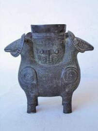 雙羊尊筒形口,腹為雙羊前軀相背狀。羊角大彎曲,尊口下飾弦紋和龍面饕餮紋,較為罕見。羊頜下及腹下飾扉棱,象征須和腹部垂毛。飾龍面紋,腹飾鱗紋,腿飾龍紋。1860年“火燒圓明園”后被掠奪并流失海外。