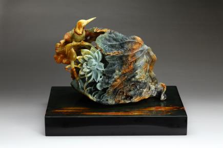 翠鳴清荷這件藝術玉雕作品,是以花玉之奇特美麗的天然花色為靈感,青黃碩大的荷葉似在隨風而舞,炫彩的翠鳥望向風來的方向,似在聆聽遠方傳來的裊裊琴音,寓動態(tài)于靜態(tài)之中,帶來無限的遐想。作品巧妙運用了玉料豐富的色澤層次,遠觀如聞鳥啼,近看猶見水紋漣漪,風動荷擺,動情傳神。