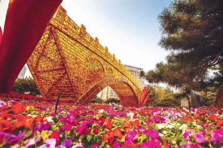 近日,一座橫架在北京東單的金色大橋吸引了來往行人的注意。這座由藝術家舒勇創(chuàng)作的大型景觀雕塑《絲路金橋》全長28米、高6米、寬4米,成為國慶67周年天安門及長安街沿線主題景觀布置中的一個重要組成部分。