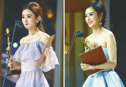 佟麗婭(右)、趙麗穎獲第28屆中國電視金鷹獎觀眾喜愛的女演員