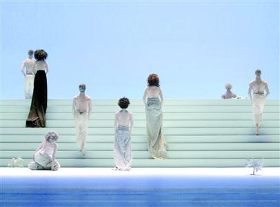 比利時(shí)超現(xiàn)實(shí)主義畫(huà)家保羅·德?tīng)栁值漠?huà)作,是沈偉創(chuàng)作《天梯》的靈感源泉,他把日常的動(dòng)作置于時(shí)空環(huán)境和視覺(jué)呈現(xiàn)都被精心設(shè)計(jì)和控制的舞臺(tái)環(huán)境之中,將舞臺(tái)塑造成一塊緩慢、勻速演變的“移動(dòng)畫(huà)布”,展現(xiàn)出一幅慵懶未知而又美麗迷人的夢(mèng)幻世界。
