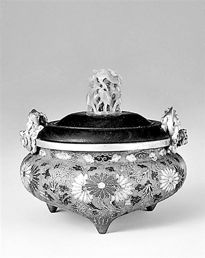 掐絲琺瑯即銅胎掐絲琺瑯,又稱“景泰藍(lán)”,其制作工藝是在金、銅胎上以金絲或銅絲掐出圖案,再填上各色琺瑯,最后通過(guò)焙燒、研磨和鍍金等多道工序完成。掐絲琺瑯菊花紋三足爐始見(jiàn)于明初,此爐造型脫胎于宣德銅爐,主題紋飾為纏枝菊花,菊花已花蕊舒展,盡情怒放,白、紅、黃、墨色相映成趣,菊花上方環(huán)繞著五彩如意云紋,纏枝菊花朵舒展飽滿,枝葉肥厚,并蒂排列。圖案布局疏朗,掐絲線條奔放有力。此爐琺瑯質(zhì)地細(xì)膩潔凈,釉面光亮,無(wú)論造型還是做工,均十分精美,是典型的明早期掐絲琺瑯作品。