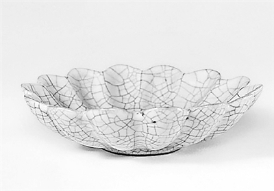這件菊瓣盤(pán)由十四棱菊瓣并列組合而成,整體看上去像一朵盛開(kāi)的菊花,造型簡(jiǎn)潔優(yōu)雅。青灰色釉素裹,開(kāi)片紋密如蛛網(wǎng),妙趣天成,堪稱古陶瓷模仿菊花造型的典范。
