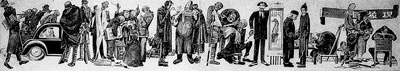 就現(xiàn)實(shí)戰(zhàn)斗性和社會(huì)震撼力而言,丁聰在抗戰(zhàn)時(shí)期和內(nèi)戰(zhàn)時(shí)期的政治諷刺畫(huà),無(wú)疑最為突出,也最能反映出他的銳氣。一幅《現(xiàn)象圖》長(zhǎng)卷,形象勾畫(huà)出抗戰(zhàn)后期的政府腐敗和社會(huì)慘狀。貪官、傷兵、淑女、官商、窮教授、沽名釣譽(yù)的畫(huà)家……形形色色的人物,構(gòu)成了現(xiàn)實(shí)生活真實(shí)的畫(huà)面。三年后創(chuàng)作的另一長(zhǎng)卷《現(xiàn)實(shí)圖》成為《現(xiàn)象圖》的延續(xù)。內(nèi)戰(zhàn)風(fēng)云中大發(fā)戰(zhàn)爭(zhēng)財(cái)?shù)闹型馍倘?、饑餓中的窮人、被迫上陣的炮灰……在丁聰?shù)墓P下,不同身份的人物排列一起,便成了那個(gè)時(shí)代的縮影。
