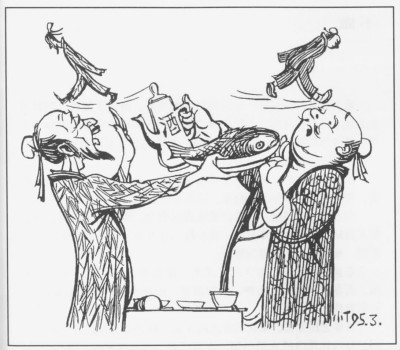 我同丁聰先生的合作,也在這個時期。一位久已成名的畫家,同一位初入文壇的晚輩,愉快合作了25年從無間斷,從一個系列到兩個系列,直至五六個系列同時進(jìn)行 (新百喻、瞎操心、京都新竹枝、準(zhǔn)花鳥蟲魚等等),總數(shù)也在八百幅以上。與此同時,他同池北偶 (譚文瑞) 先生也有《世態(tài)譏彈》 的合作,他還為許多文學(xué)作品作了插圖。