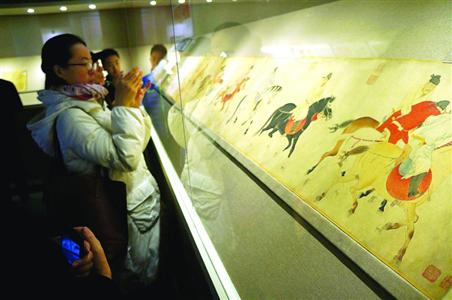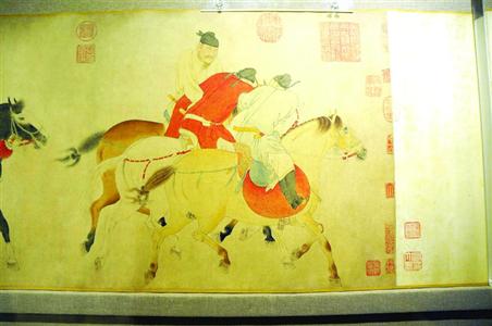 《五王醉歸圖卷》創(chuàng)作于元代,但用的是宋代紙本,長(zhǎng)達(dá)2.12米,刻畫(huà)了唐玄宗五兄弟在一起騎馬游玩的場(chǎng)景。