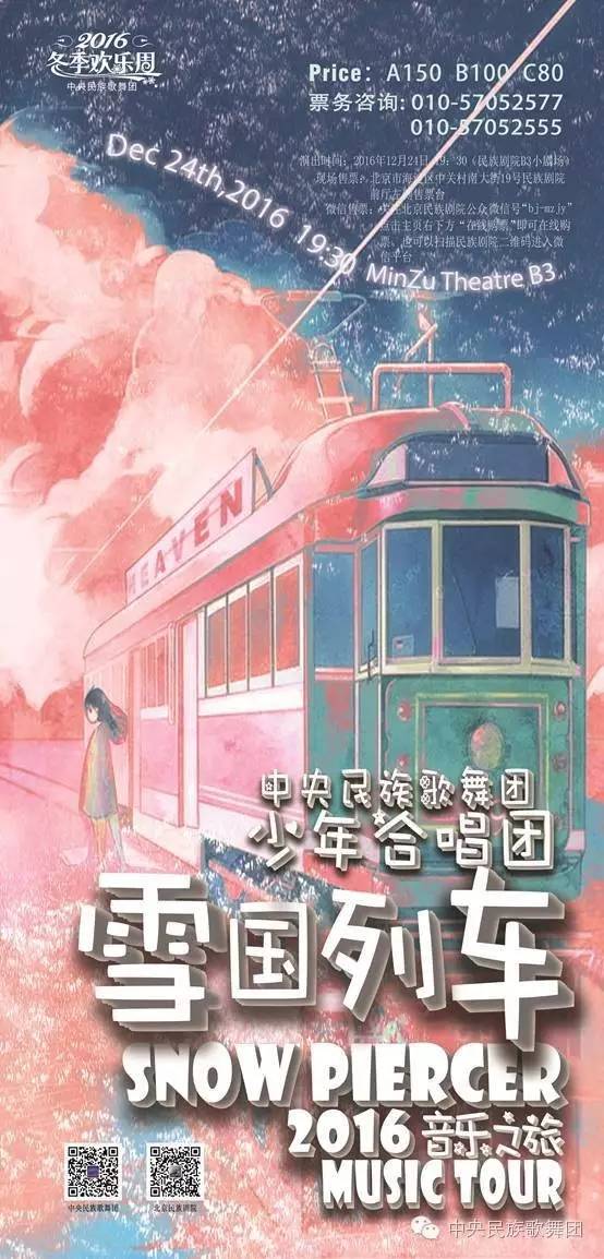 2016年度中央民族歌舞團(tuán)少年合唱團(tuán)的音樂(lè)會(huì)將于12月24日晚在民族劇院B3小劇場(chǎng)舉行,音樂(lè)會(huì)以“雪國(guó)列車”為主題,希望在平安夜的雪花中帶領(lǐng)觀眾一起搭乘雪國(guó)列車開啟一次音樂(lè)之旅。