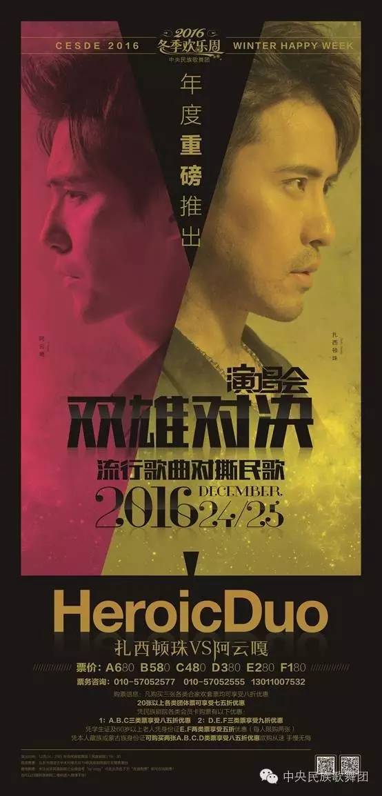 2016冬季歡樂(lè)周的重點(diǎn)演出無(wú)疑將是《雙雄對(duì)決——扎西頓珠VS阿云嘎》這臺(tái)獨(dú)特的音樂(lè)會(huì),是一次音樂(lè)人之間的對(duì)話和握手,這場(chǎng)獨(dú)一無(wú)二的演出不容錯(cuò)過(guò)。