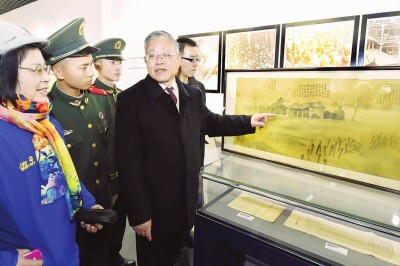 葉永烈向參觀者介紹他捐贈的《申江戰(zhàn)焰圖》,這是日軍侵華的有力罪證。本報記者趙立榮攝