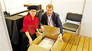 本屆古書展顧問鐘芳玲與麥格斯兄弟古書店負(fù)責(zé)人在打包《賽勝獵報(bào)》。