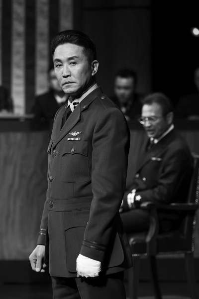 劇場里,開場鐘早已敲過三遍,格林渥穿著硬朗帥氣的軍人制服站在舞臺上,發(fā)絲根根锃亮,兩側(cè)剃得極短,帶著烏青。他巧舌如簧,質(zhì)疑著每一個企圖為原告作證的人,他是被告的律師,卻以狡黠的詭辯取得了最終勝利;而走出法庭后,他才說出了潛藏內(nèi)心的真實想法。