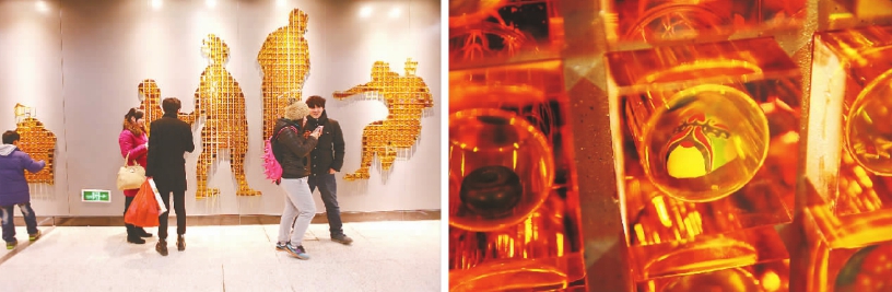王中: 《北京·記憶》的整體藝術(shù)形象由4000余個(gè)琉璃鑄造的單元立方體以拼貼的方式呈現(xiàn)出來(lái),用剪影的形式表現(xiàn)了具有老北京特色的人物和場(chǎng)景,如街頭表演、遛鳥(niǎo)、拉洋車等。有趣的是每個(gè)琉璃塊中都珍藏著由生活在北京的人提供的一個(gè)老物件,比如一個(gè)紀(jì)念徽章、一張糧票、一個(gè)頂針、一個(gè)珠串、一張黑白老照片等等。這一個(gè)個(gè)時(shí)代的縮影,在不經(jīng)意間勾起了人們對(duì)北京過(guò)往歲月的溫暖回憶。