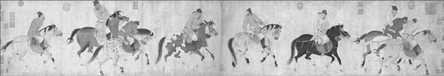 任仁發(fā)在繪畫過程中,常以鐵線勾勒、淡彩暈染,遵循唐代畫馬風格,并將人物與馬的場景描繪在同一幅畫卷中,此《五王醉歸圖》不僅題材取材于唐,畫法也師承于唐代韓干和北宋李公麟。描繪的是登基之前的唐明皇李隆基與他的四個兄弟出游飲酒,醉后騎馬返回時的情景。