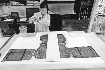 圖③:工作人員正在給絲織品噴灑加固液。資料圖片