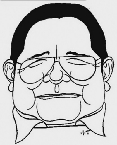 這部“肖像集”中的大多數(shù)圖,由于簡(jiǎn)潔生動(dòng),已在報(bào)刊上多處引用,所以很多讀者都曾見(jiàn)到。不過(guò)其中與畫(huà)相配“寫(xiě)”的內(nèi)容,人們也許了解略少。譬如曾任三聯(lián)書(shū)店老總的范用對(duì)自己的漫畫(huà)肖像說(shuō):“我很丑,也不溫柔。一本正經(jīng),鬼都不相信。謹(jǐn)防上當(dāng),不要跟著感覺(jué)走。十足糊涂蟲(chóng),左右拎勿清。曾經(jīng)深愛(ài)過(guò),曾經(jīng)無(wú)奈過(guò)。誰(shuí)能告訴我,什么是什么。”這其中的滋味,人過(guò)中年也許都不難體會(huì);著名漫畫(huà)家華君武面對(duì)自己的肖像漫畫(huà)自述:“我屬兔,1915年生,大概在1992年,請(qǐng)人刻了一塊閑章‘大愚若智’,也用在某些漫畫(huà)上,實(shí)際上也是對(duì)我?guī)资旯ぷ鞯目偨Y(jié)。”倘若稍稍反省,“大愚若智”不是我們生存中常見(jiàn)的有趣人生現(xiàn)象嗎?