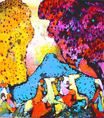 康定斯基用他的創(chuàng)作證明著他的理論。他早期的創(chuàng)作受野獸主義的影響,傾向于使用平涂色塊,色彩從描述中分離出來,畫面中的各種物體的重量仿佛被色彩的活力拔了錨似的,充滿了古怪的膨脹和異常的喧鬧。1909年,康定斯基在《穆爾諾附近有火車頭的風(fēng)景》里描畫了一個色彩絢麗的、有點像玩具的似夢的幸福世界,這是這個時期常常出現(xiàn)在他作品中的世界對象,這種天真的浪漫主義幻景以斯拉夫神話故事中的往事的形式出現(xiàn)。