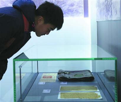 一名學生仔細觀看淞滬抗戰(zhàn)實物