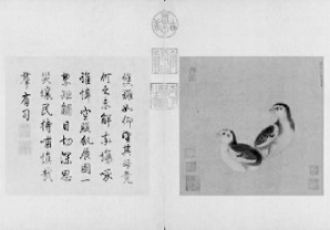 據(jù)了解,此幅宋代王凝《子母雞圖》原是《集古圖繪》中的一頁(yè)。米芾在《畫史》中說(shuō),王凝是江南人,當(dāng)過(guò)北宋畫院待詔,工鳥獸,善寫鸚鵡、獅、貓,不僅形似,也注重神態(tài),自成一格。而《宣和畫譜》則評(píng)價(jià)其“下筆有法,頗得生意。又工為鸚鵡及獅、貓等,非山林草野之所能,不唯責(zé)形象之似,亦兼取其富貴態(tài)度,自是一格,茍不能焉,終不到也?!?/p>