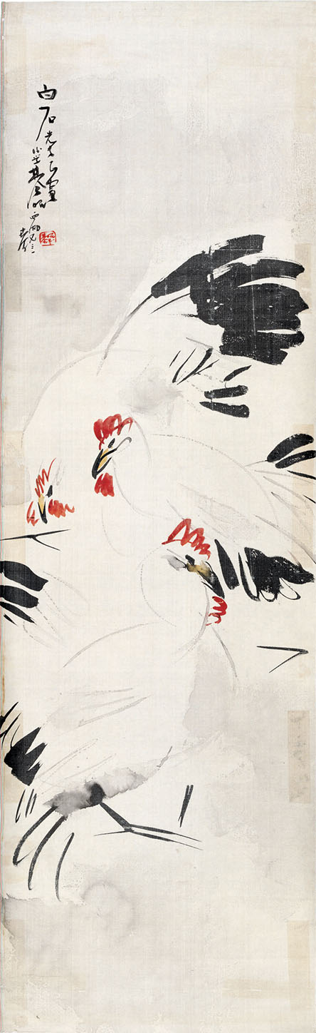 他用相近的筆法描繪了枝干、花葉,雀鳥姿態(tài)相似,并沒有對(duì)眼、爪、羽、翅的細(xì)致描繪,只有頭部向左樣統(tǒng)一中,呈現(xiàn)出單純、明朗、突出的藝術(shù)風(fēng)格。創(chuàng)作于上世紀(jì)五六十年代的《寒鴉》《貓頭鷹》,作品通過黑白的對(duì)比,營造出沉郁孤寂的意境,卻又不一味地消沉或顧影自憐,仿佛在感傷中蘊(yùn)涵著勃發(fā)的生命力和無限的希望。