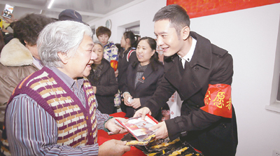 2015年11月,黃曉明在天津為老人發(fā)放黃手環(huán)