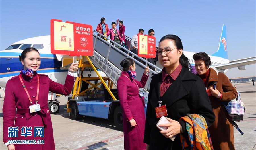 3月2日,出席十二屆全國人大五次會議的廣西代表團乘坐飛機抵達北京。新華社記者趙穎全攝