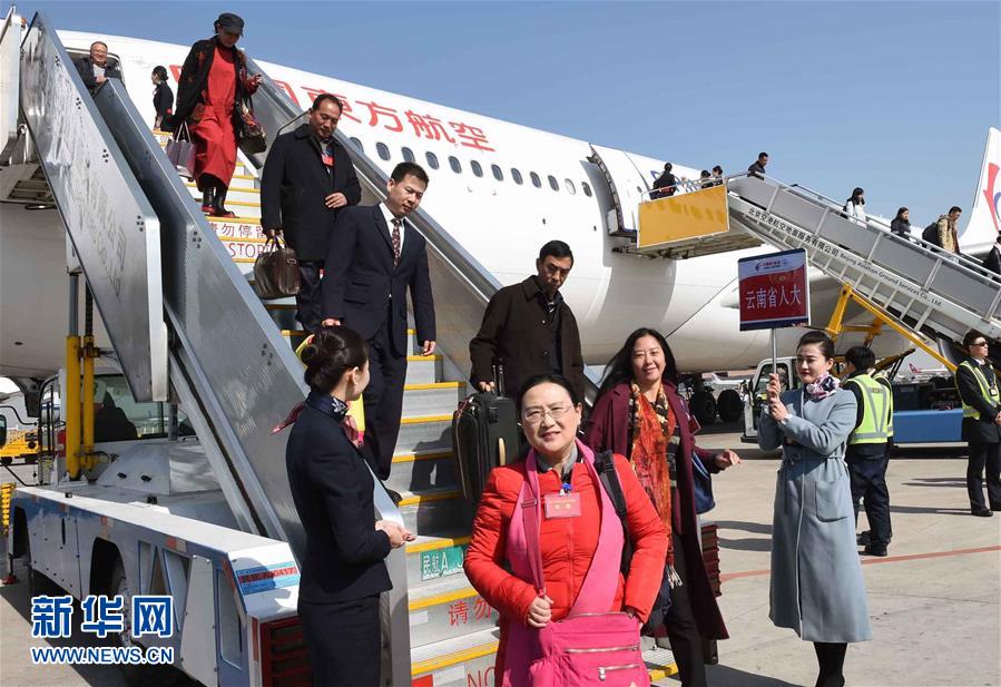 3月2日,出席十二屆全國人大五次會議的云南代表團乘坐飛機抵達北京。新華社記者楊宗友攝