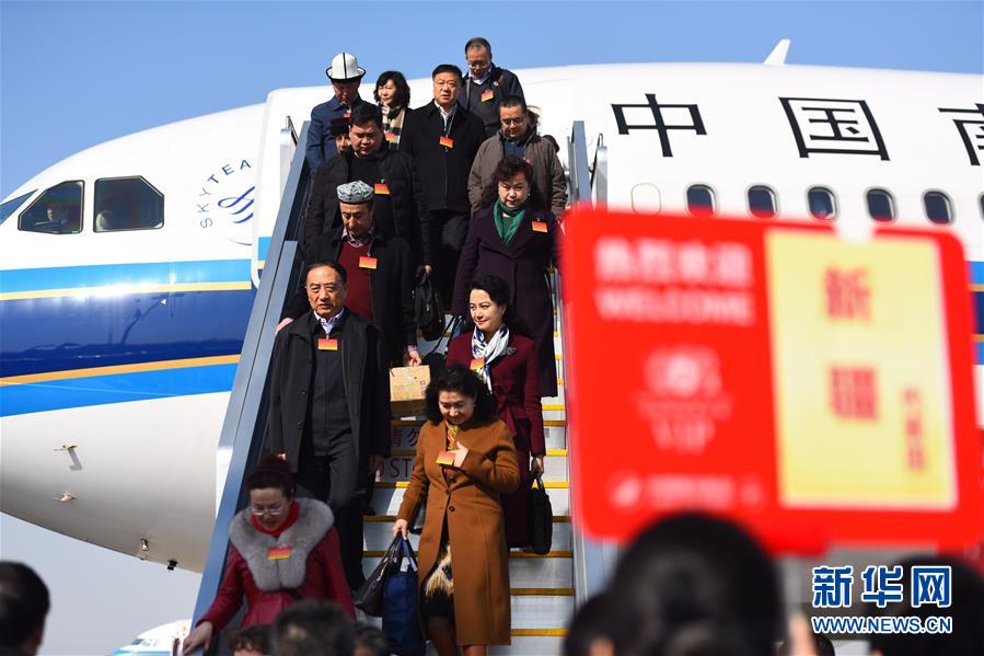 3月2日,出席十二屆全國人大五次會議的新疆代表團乘坐飛機抵達北京。新華社記者陳曄華攝