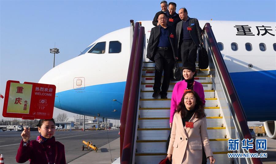 3月2日,出席十二屆全國人大五次會議的重慶代表團乘坐飛機抵達北京。新華社記者趙穎全攝