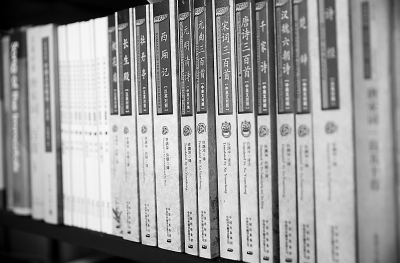 書架上擺滿了許淵沖的譯作。徐俊雄攝