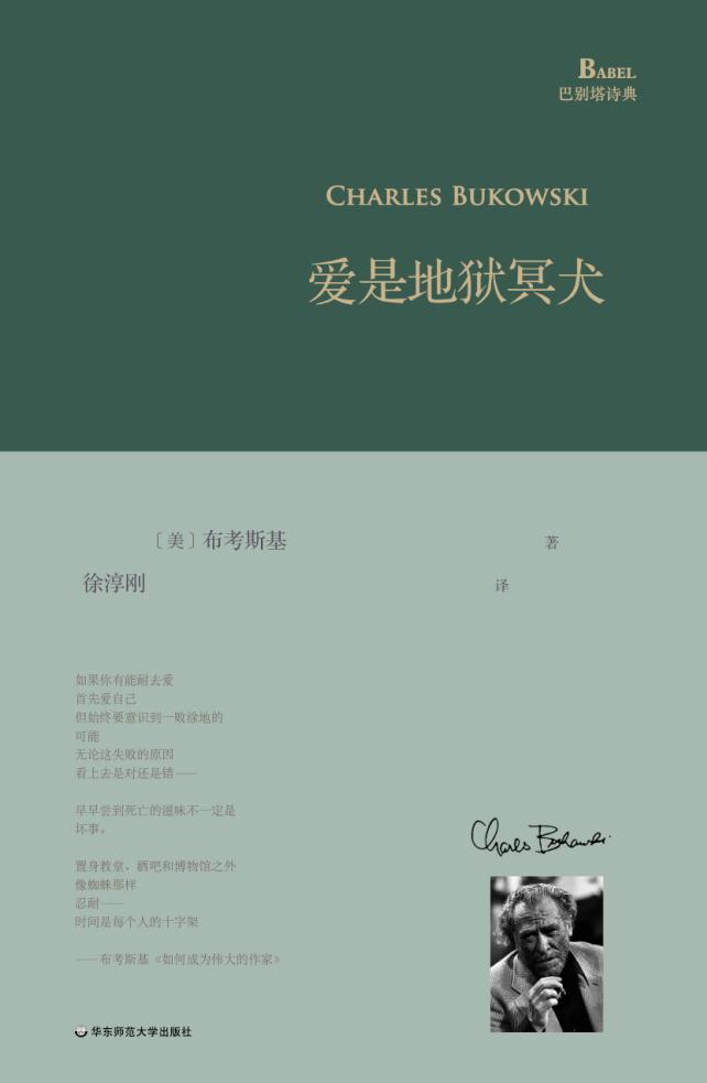 在美國(guó),布考斯基早已是非學(xué)院派的偉大經(jīng)典了。他的作品更以十多種語(yǔ)言在世界各地出版,尤其在歐洲廣為流傳,累計(jì)銷售數(shù)百萬(wàn)冊(cè)。就中國(guó)而言,臺(tái)灣已出了他的幾部作品集,大陸也正式出版了他的兩部小說(shuō)集,而地下的翻譯、出版也有很多。很幸運(yùn),這部《愛(ài)是地獄冥犬》(Love Is A Dog From Hell),是第一本在國(guó)內(nèi)公開(kāi)出版發(fā)行的布考斯基詩(shī)集,可以讓更多喜歡布考斯基的人讀到。這部詩(shī)集首版于1977年,內(nèi)容都是布考斯基的私生活,抒寫(xiě)了布考斯基坦蕩不羈的愛(ài),他的女人,他的絕望,他的傷痛,他的勇氣……時(shí)隔近40年這部詩(shī)集終于有了中文版,這首先要感謝華東師范大學(xué)出版社,感謝何家煒兄為這本詩(shī)集的編輯出版所做的大量工作。感謝詩(shī)人、出版人方閑海,他于2013年獨(dú)立出版的拙譯《生來(lái)如此——布考斯基詩(shī)集》,讓我為這本詩(shī)集的翻譯出版積累了很多經(jīng)驗(yàn)。感謝大家,對(duì)我翻譯工作的信任與期待。讓我們通過(guò)詩(shī)歌,繼續(xù)思考展現(xiàn)在我們面前的生活。