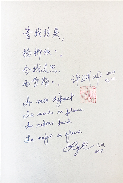 在《朗讀者》現(xiàn)場(chǎng),許淵沖先生送給主持人董卿一張名片,上面印著“書銷中外百余本,詩(shī)譯英法唯一人”。的確,許淵沖雖然擅長(zhǎng)中英法互譯,涉足小說、詩(shī)歌、散文等眾多文學(xué)領(lǐng)域,但他最突出的成就仍然是將詩(shī)、詞、曲、賦、戲曲這樣的中國(guó)傳統(tǒng)韻文翻譯成英文、法文。正是在韻文翻譯領(lǐng)域,他廣泛實(shí)踐了自己追求“真”與“美”結(jié)合的翻譯理論。例如,李白名詩(shī)《靜夜思》的翻譯,他沒有直譯“床前明月光”,而是譯成“before my bed a pool of light(我的床前一池光)”,借用pool(池塘)的意象,勾勒出西方人熟悉的場(chǎng)景。我喜愛收藏簽名題跋的圖書。許淵沖在他新近出版的法譯本《詩(shī)經(jīng)》扉頁(yè)給我寫下了《詩(shī)經(jīng)·采薇》中的名句“昔我往矣,楊柳依依。今我來思,雨雪霏霏”。其中,他沒有把“依依”簡(jiǎn)單地翻譯成柳枝搖擺的動(dòng)作,而是采用“saule en pleurs(楊柳哭泣)”表達(dá)出依依不舍流下眼淚的意象;他沒有把“霏霏”簡(jiǎn)單翻譯成雨雪飛揚(yáng)的情景,而是采用“La neige en fleurs(雪如花)”表達(dá)出“千樹萬樹梨花開”的壯美意象。當(dāng)有人批評(píng)他不忠實(shí)于原文時(shí),他強(qiáng)調(diào),忠實(shí)并不等于形似,更重要的是神似。
