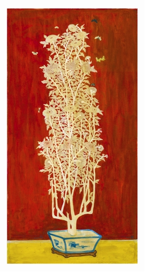 靜物則是常玉運用東方美學(xué)與西方素材之最佳典范,史博館共有靜物27件。常玉愛畫盆景,以不合比例的小花盆、具有個人符號意味的鹿角枝,撐起中國色彩的牡丹、菊花、玫瑰、果實和雀鳥等,有著西方圣誕樹的熱鬧堆疊,繁盛中卻不無落寞之意,不免令人將其不順遂的人生與八大山人相比擬。也讓人想起吳冠中評價他的話:“常玉畫了那么多盆景,盆景里開出綺麗的繁花,生意盎然;盆景里茍延著凋零的殘枝,凄凄切切,卻鋒芒畢露……我覺得常玉自己就是盆景,巴黎花園里的東方盆景……”